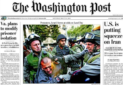 Portada de The Washington Post del sábado: un policía israelí ataca con gas pimienta a un manifestante palestino en Jerusalén en la movilización del Día de la Tierra. No es frecuente que un periódico norteamericano coloque en su portada una imagen tan clara de la represión policial en Israel (y por eso a algunos les ha molestado). Es probable que en el texto se hable de enfrentamientos, pero la imagen tiene la fuerza suficiente como para dejar claro quién está en condiciones de ejercer la máxima violencia.